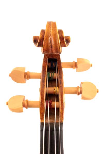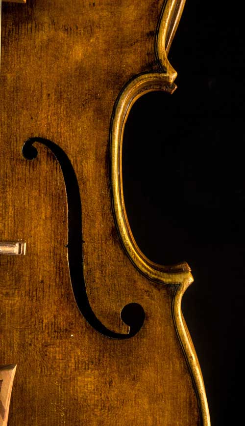 For this viola I have sought as usual to capture several elements of multiple instruments by this master. Long corners are a matter of course, purfling distance set close to the edges, however with a tasteful amount of antiquing/wear. This instrument has low arching and was meant to be a viola intended for a soloist, with much projection and power to its tone. Wide sound holes, and a slightly higher inclination to the neck angle have resulted in more tension towards this aim.
