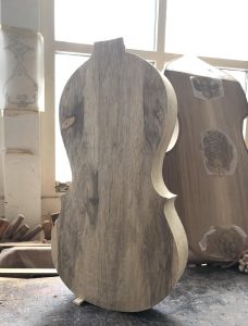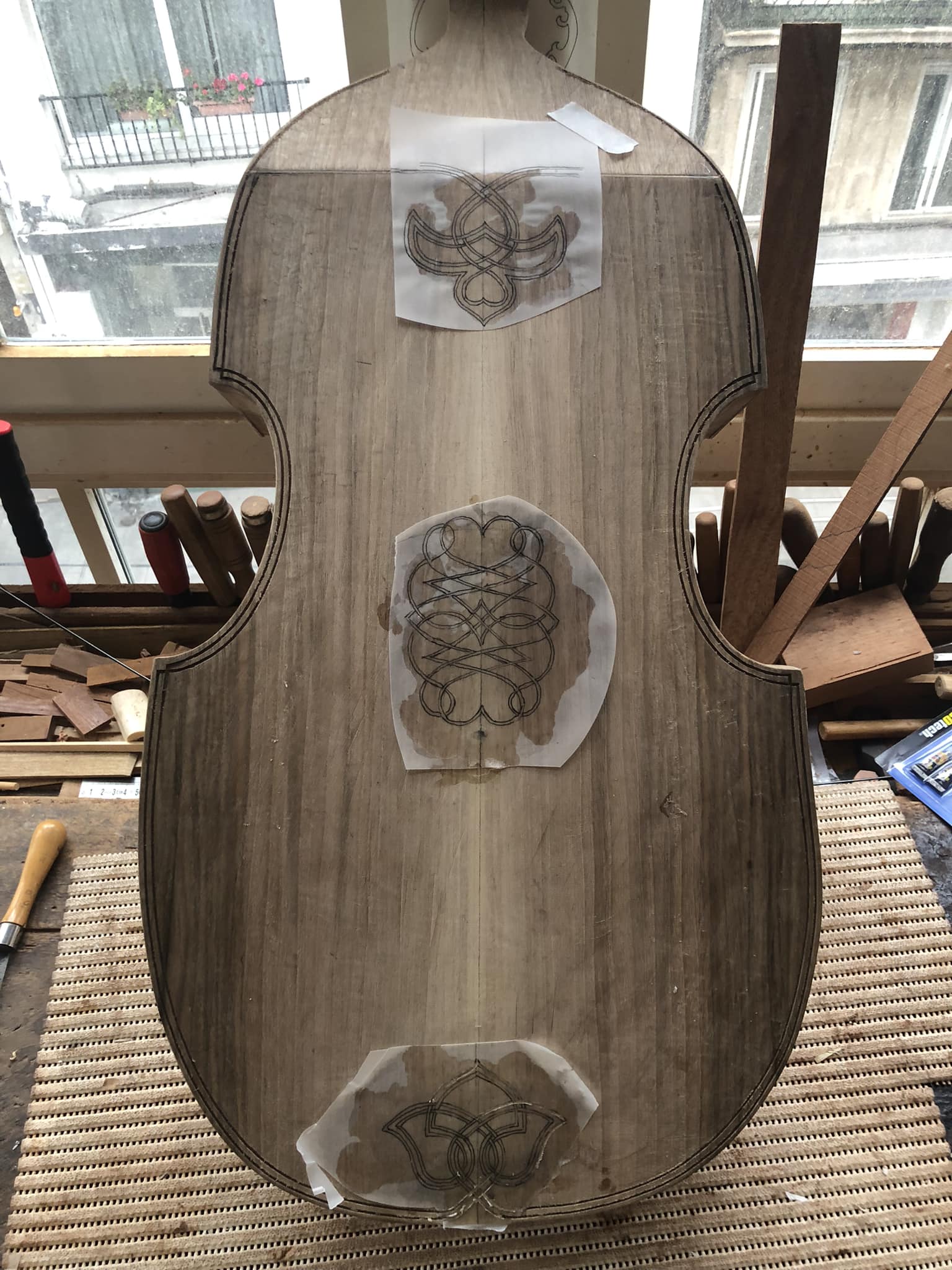 Inspired by the Napper Barak Norman bass viol, this walnut corpus instrument is a tribute to rare woods and fantasy sounds. The female carved head will feature a Moorish queen, the corpus with extensive and elaborate floral and purfling inlay. (SOLD)