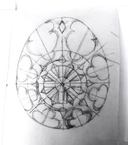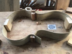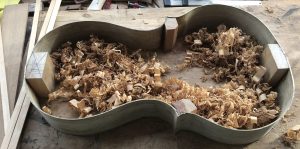 Viols with violin shaped outlines in the Italianate tradition offer a unique opportunity for expression of feeling and sound. This tenor with a corpus size of 56cm will have an all cedar top, with wonderfully figured Mahogany for the ribs and back. Like the original in the Orpheon consort collection, both plates will be arched, adding to the possibility of total control of sound. The rather heavy Blackwood scroll will provide a counterbalance in weight ratios, as well as optically matching the palates of maroon hues in the corpus.